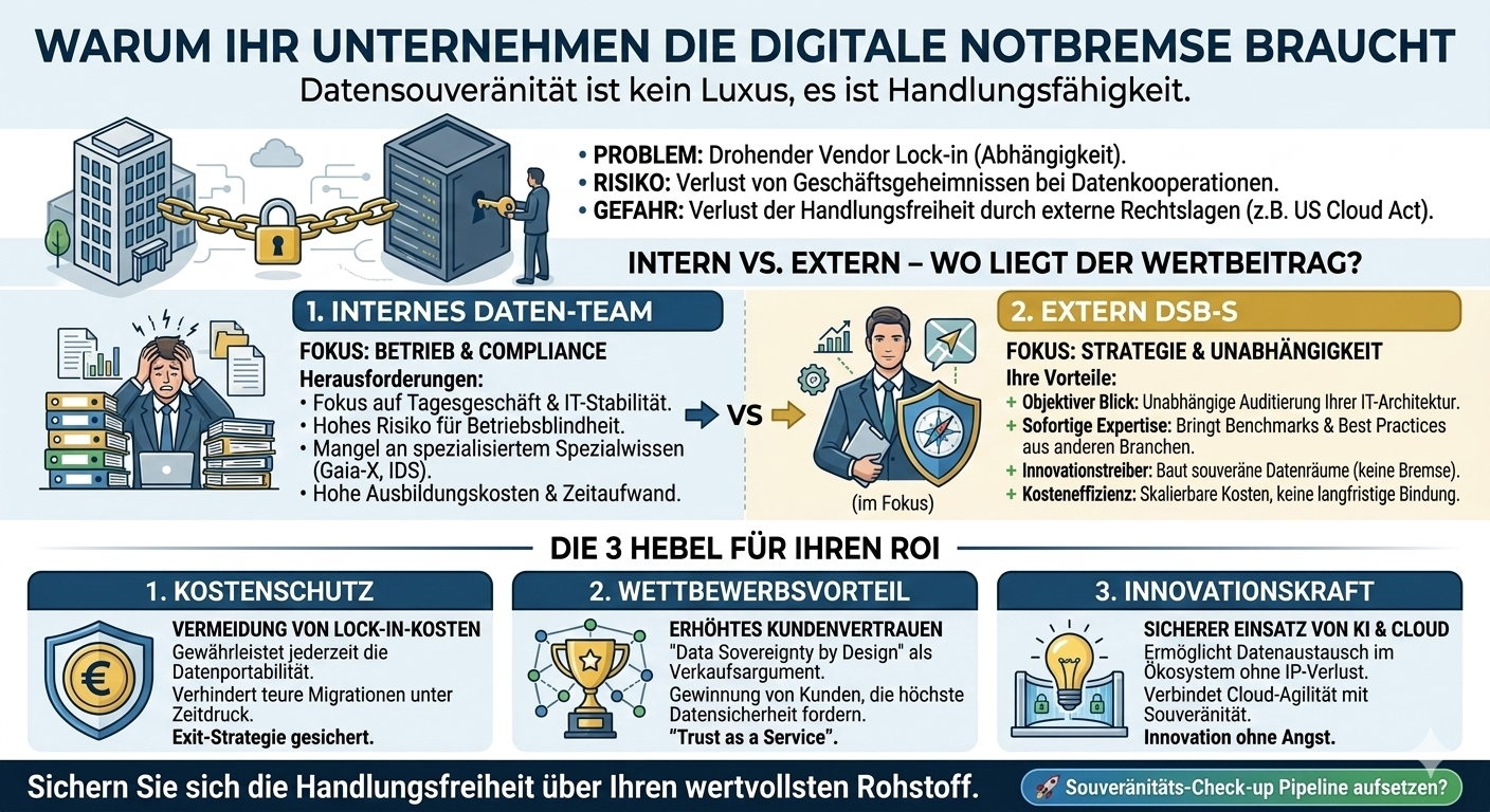 Sie wandelt Daten von einem potenziellen Risiko in einen geschützten Vermögenswert um. Der Einsatz eines externen Datensouveränitätsbeauftragten ist eine smarte Investition, das Ihr Unternehmen vor Risiken schützt und Wettbewerbsvorteile sichert. Er übernimmt nicht nur Beratung und Umsetzung, sondern bringt unabhängige Expertise direkt auf den Tisch – ohne interne Konflikte.