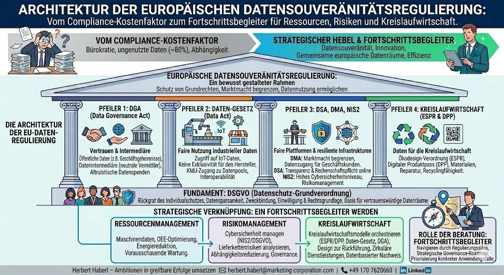 Wer genauer hinschaut, erkennt jedoch eine Architektur: ein bewusst konstruiertes Regelwerk, das zugleich Grundrechte schützt, Marktmacht begrenzt und Datennutzung für Innovation, Effizienz und Kreislaufwirtschaft ermöglicht. Für den industriellen Mittelstand kann diese Architektur vom Compliance‑Korsett zum Fortschrittsbegleiter werden – vorausgesetzt, Datensouveränität wird strategisch mit Ressourcen‑ und Risikomanagement verknüpft.