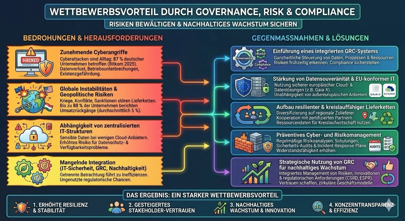 Wer in dieser Situation seine Wettbewerbsfähigkeit und Unabhängigkeit sichern will, braucht mehr als klassische IT-Sicherheitsmaßnahmen: Es braucht ein integriertes GRC-System (Governance, Risk & Compliance), das Datensouveränität und Kreislaufwirtschaft zusammen denkt. Denn nur wer Daten, Prozesse und Ressourcen souverän steuert, kann nachhaltig handeln, Risiken früh erkennen – und regulatorische Chancen gezielt nutzen.