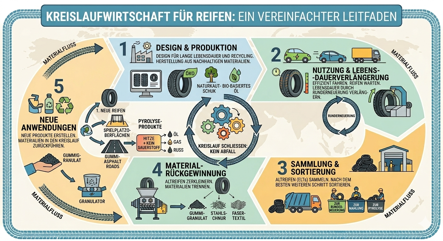Produktgestaltung anpassen: Reifen auf Haltbarkeit, Rezyklatnutzung und Ökodesign optimieren; laufende Studien liefern spezifische Kriterien.